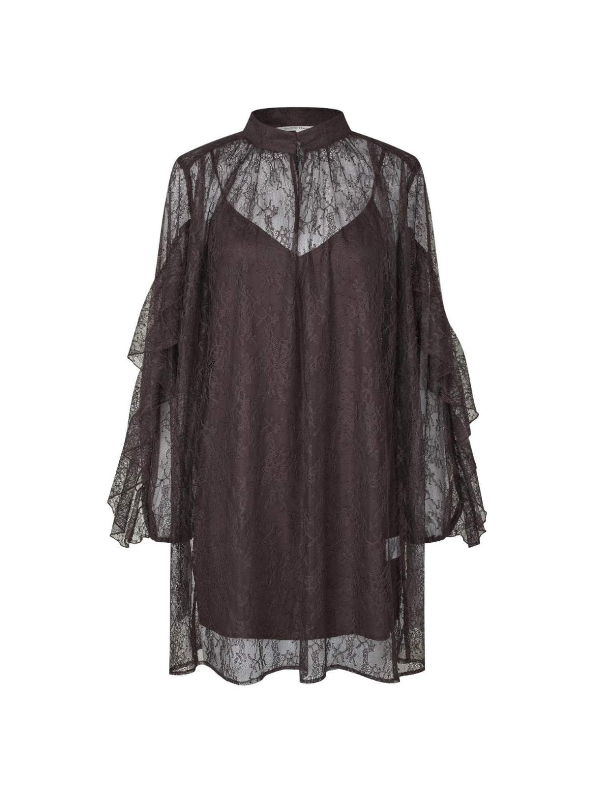Elegant blondebluse i en dyb brun nuance med et romantisk og eksklusivt udtryk. Den transparente kvalitet og fine mønster skaber et feminint look med smukke detaljer. Designet med høj hals og lette, voluminøse ærmer, der giver et sofistikeret fald. Perfekt til både festlige anledninger og stilfulde lag-på-lag outfits.
