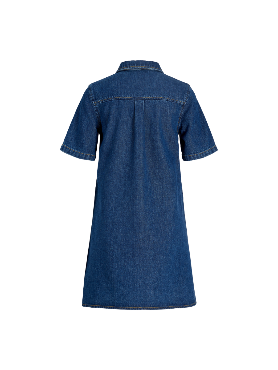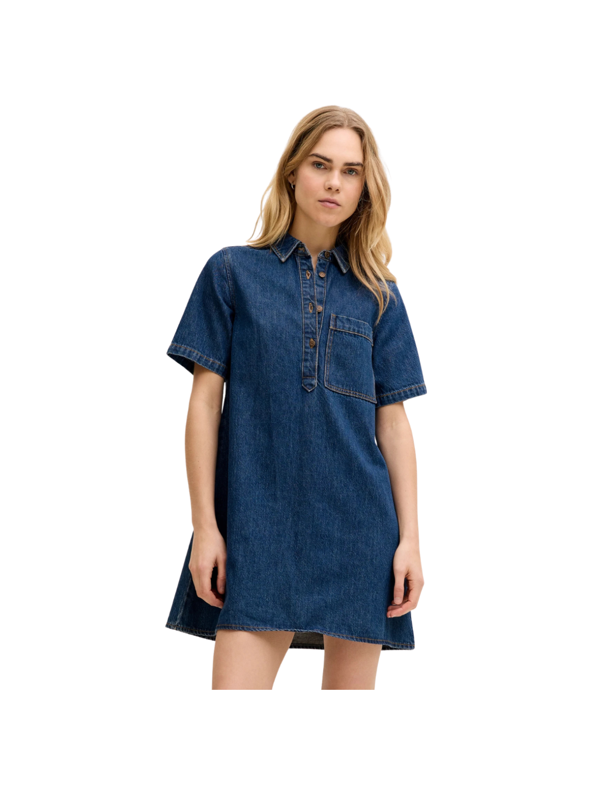 Cool denimkjole i en klassisk blå vask med et afslappet og moderne udtryk. Den lige pasform og de korte ærmer giver en behagelig silhuet, mens kraven og knaplukningen tilfører et skjorteinspireret look. Den store brystlomme giver et casual og råt touch. Perfekt til hverdagsbrug – style den med sneakers for et afslappet look eller med sandaler for en let og sommerlig styling.