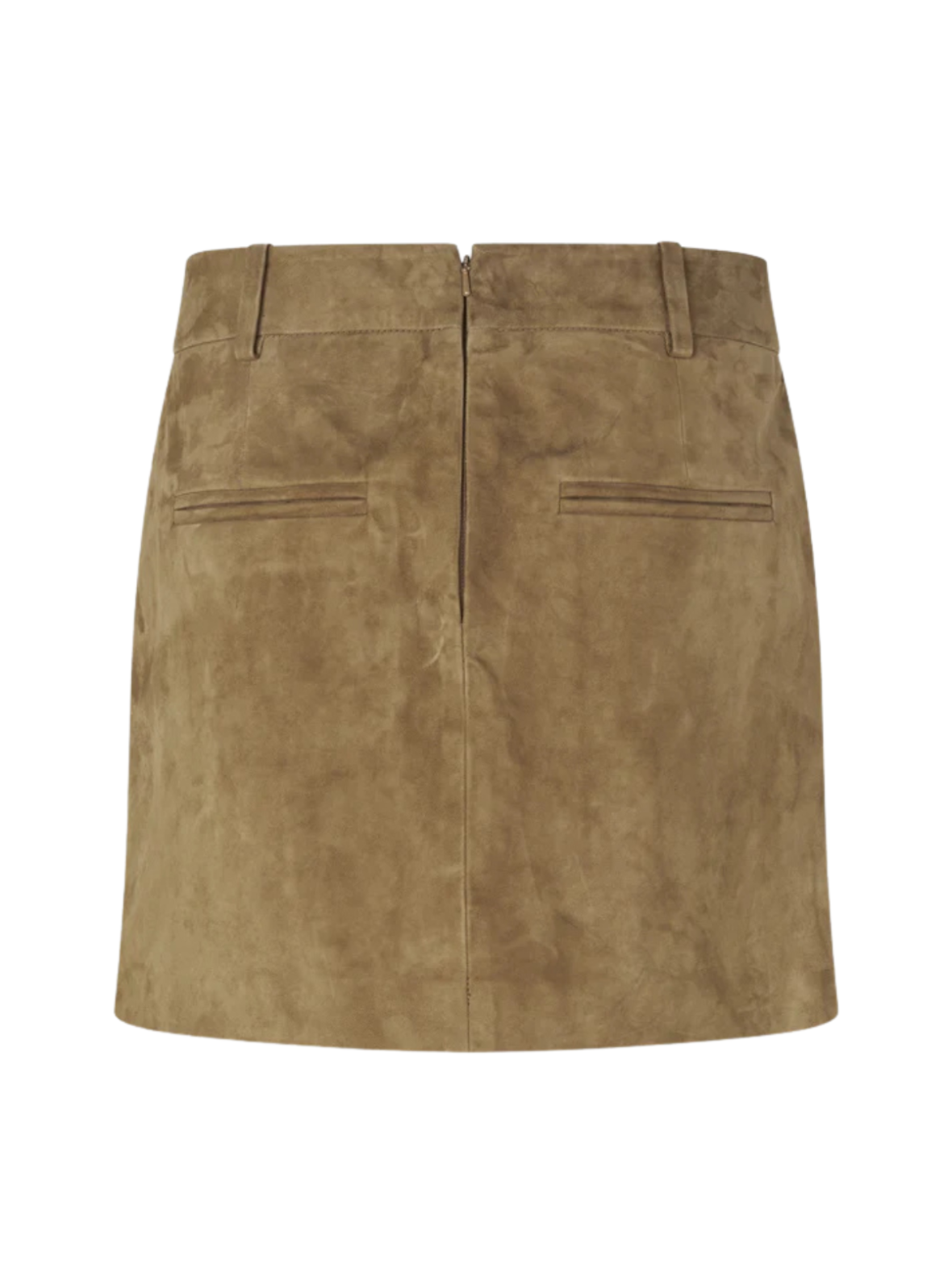 Klassisk nederdel i en smuk brun nuance med eksklusiv ruskindslook. Den enkle A-formede silhuet giver et flatterende og tidløst udtryk, mens det bløde materiale tilfører et luksuriøst touch. En alsidig style, der kan bruges sæson efter sæson. Style den med en strik og støvler for et sofistikeret hverdagslook – eller med en skjorte og hæle for en mere elegant styling.