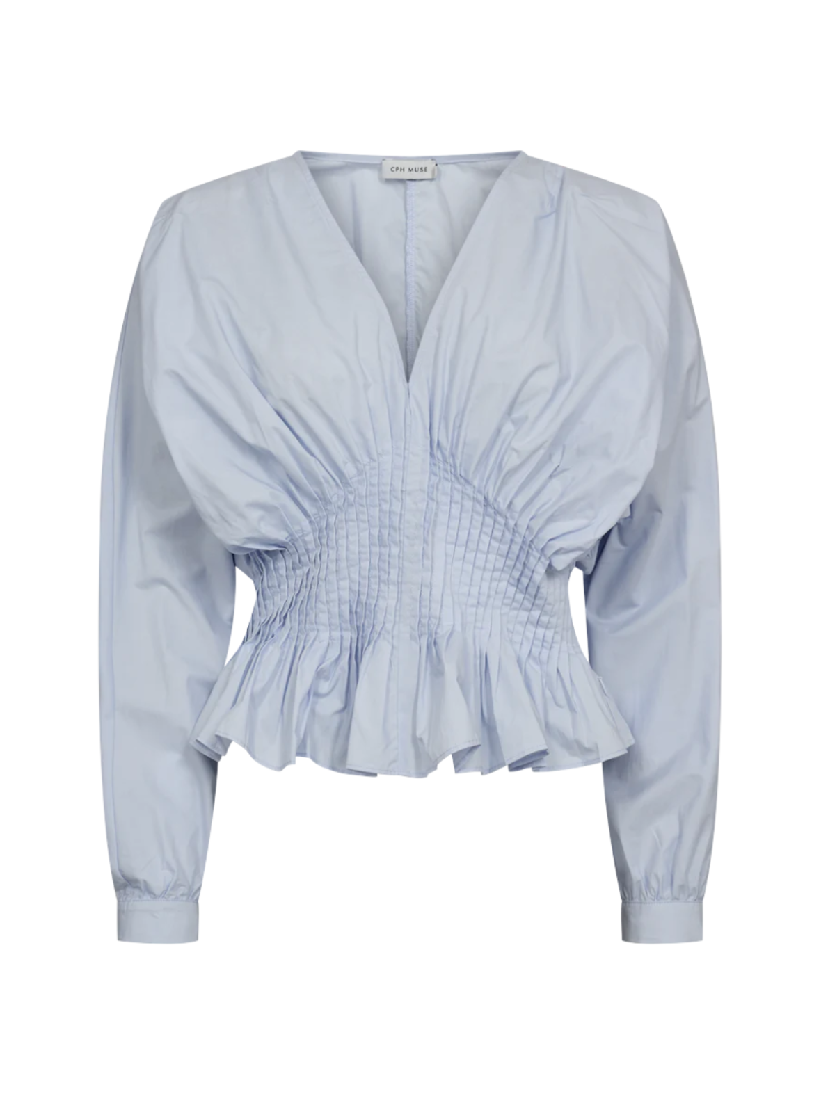 Feminin bluse i en smuk lyseblå nuance med et elegant og moderne udtryk. Den markerede talje med fine rynkedetaljer skaber en flatterende silhuet. V-udskæringen og de let voluminøse ærmer tilfører et sofistikeret touch. Perfekt til både hverdag og pænere anledninger.