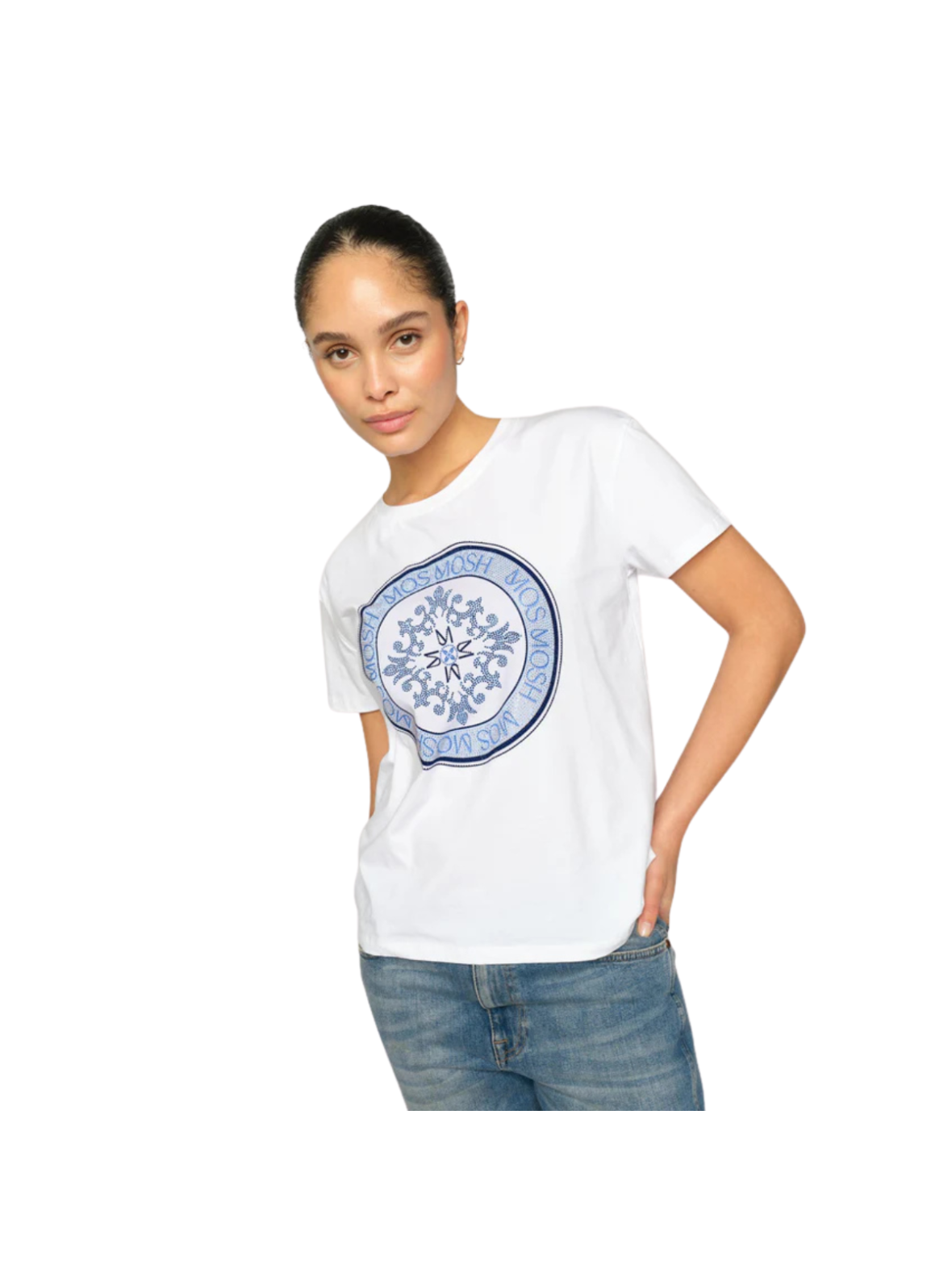 Klassisk T-shirt i hvid med et dekorativt frontprint i blå nuancer. Det runde grafiske motiv giver et stilrent og moderne udtryk med et let sporty touch. Den afslappede pasform og bløde kvalitet gør den behagelig at have på hele dagen. En alsidig style, der nemt kan indgå i enhver garderobe. Style den med jeans for et casual look – eller med en nederdel og sneakers for en feminin og cool styling.