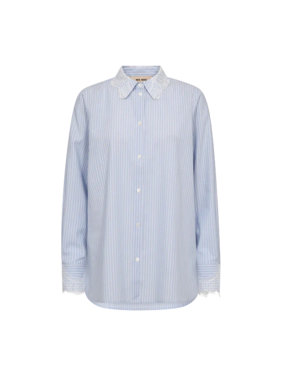 Klassisk skjorte i lyseblå med fine striber, der giver et elegant og tidløst udtryk. De feminine blondedetaljer ved krave og manchetter tilfører et sofistikeret og romantisk twist. Den løse pasform gør den behagelig og alsidig at style. Perfekt til både arbejde og pæne hverdagslooks.