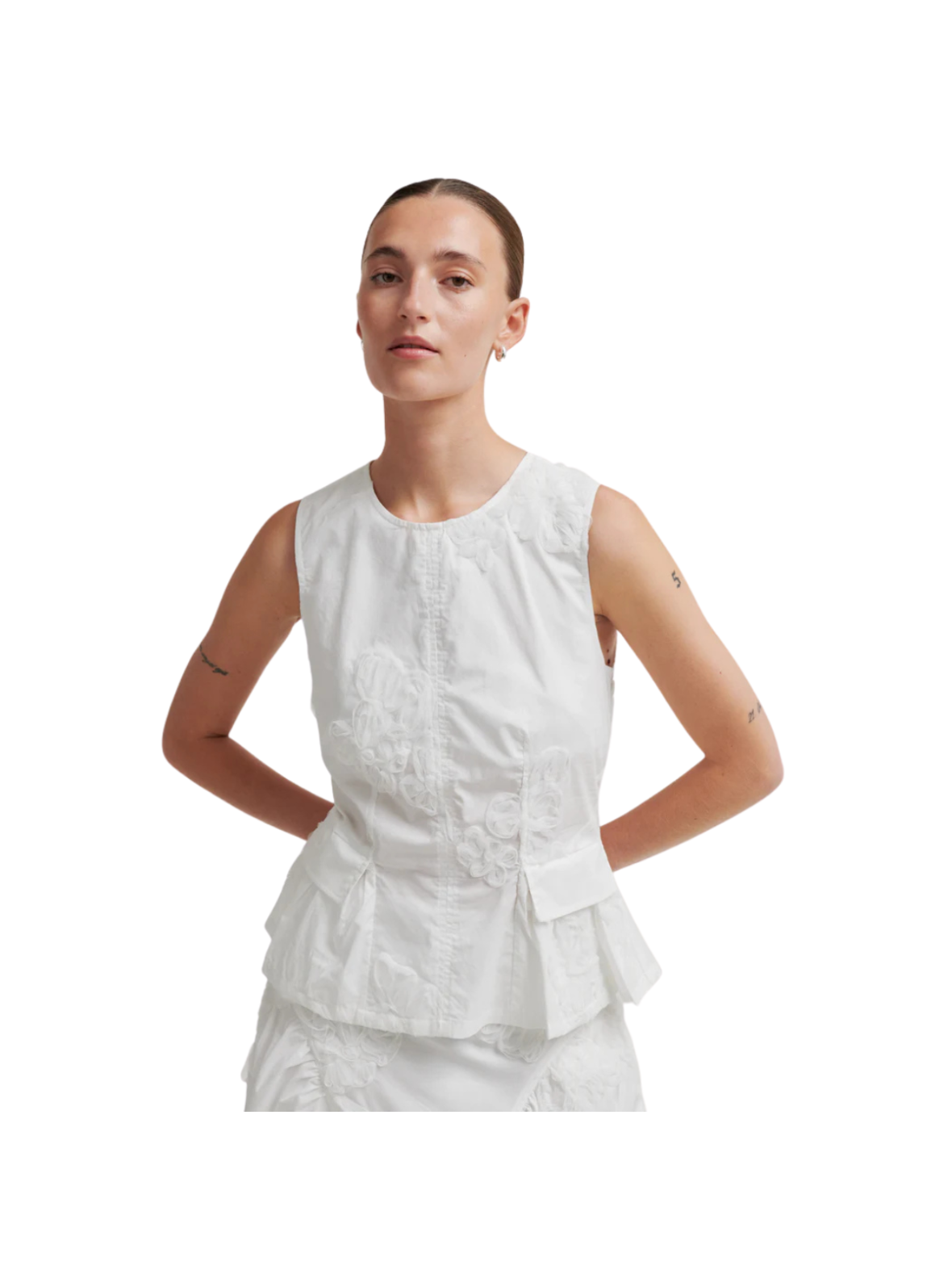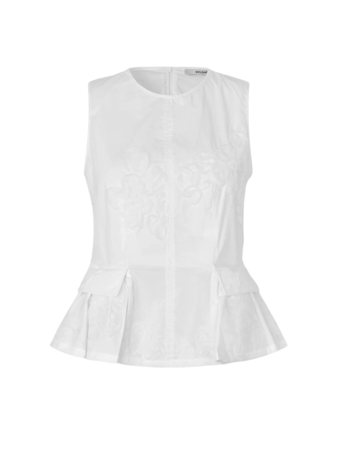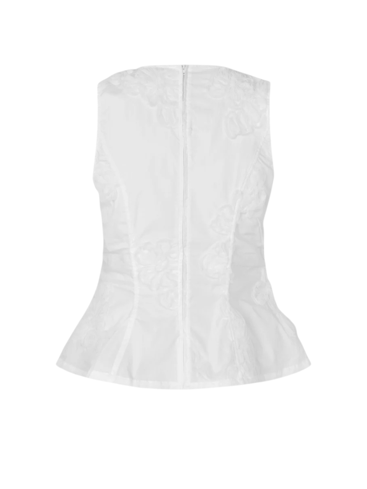 Elegant top i klassisk hvid med fine, broderede detaljer, der giver et eksklusivt og feminint udtryk. Den ærmeløse silhuet og peplum-effekten skaber en smuk, markeret talje og et let fald. Et stilrent design med dekorative elementer, der løfter looket. Style den med bukser eller nederdel for en sofistikeret styling – eller med jeans for et moderne og feminint hverdagslook.