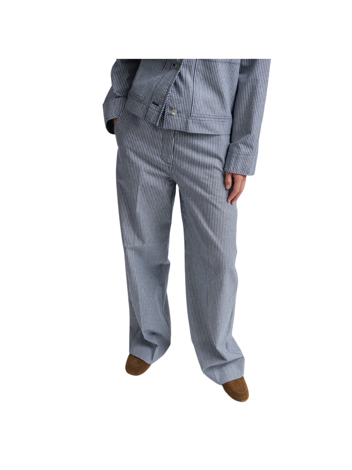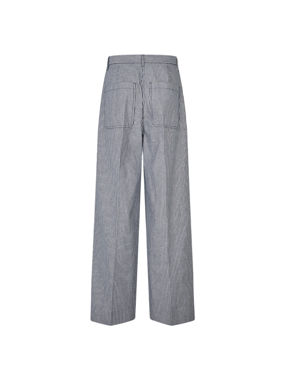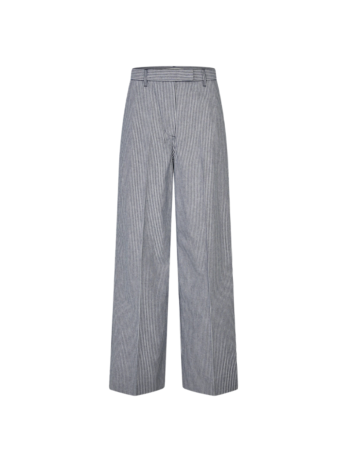 Stilrene bukser med fine, lodrette striber i en klassisk blå og hvid kombination. Den høje talje og den lige, let vide pasform giver en flatterende og moderne silhuet. Et tidløst design med et elegant og afslappet udtryk. Style dem med en skjorte for et sofistikeret look – eller med en enkel T-shirt og sneakers for en mere casual og moderne styling.