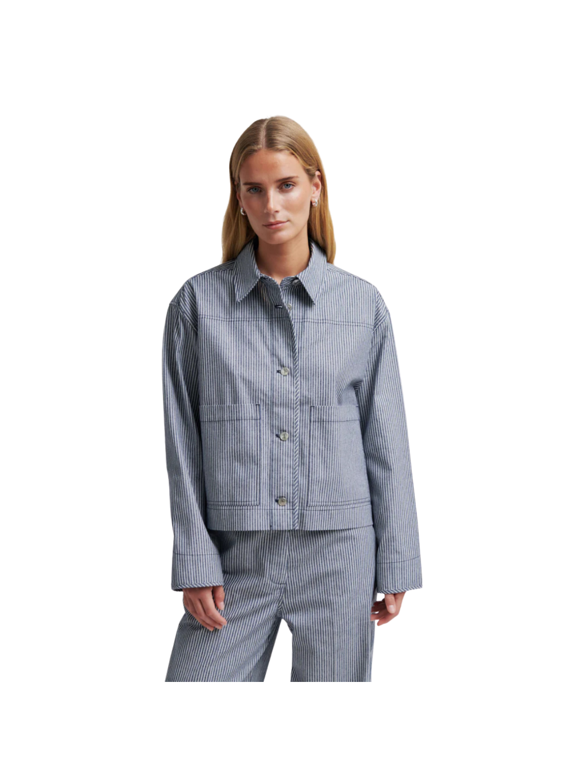 Cool jakke med fine, lodrette striber i en klassisk blå og hvid kombination. Den korte, boxy pasform og de store frontlommer giver et moderne og afslappet udtryk, mens knaplukningen tilfører et tidløst touch. En alsidig style, der fungerer perfekt til lag-på-lag. Style den med matchende bukser for et gennemført look – eller med jeans og en T-shirt for en mere casual og cool styling.
