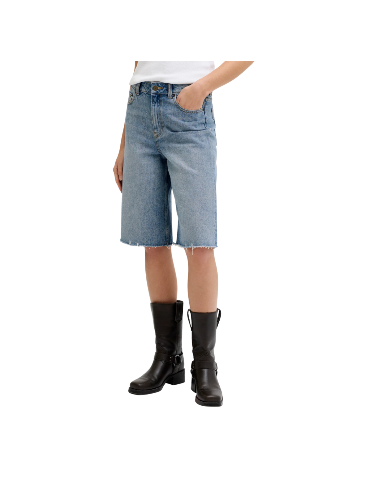 Cool denimshorts i en lys blå vask med et afslappet og moderne udtryk. Den høje talje og den lange, løse pasform giver en trendy silhuet, mens de rå kanter tilfører et casual og let edgy touch. En alsidig style, der er perfekt til hverdagsbrug. Style dem med en T-shirt og sneakers for et afslappet look – eller med en skjorte og sandaler for en mere gennemført og sommerlig styling.