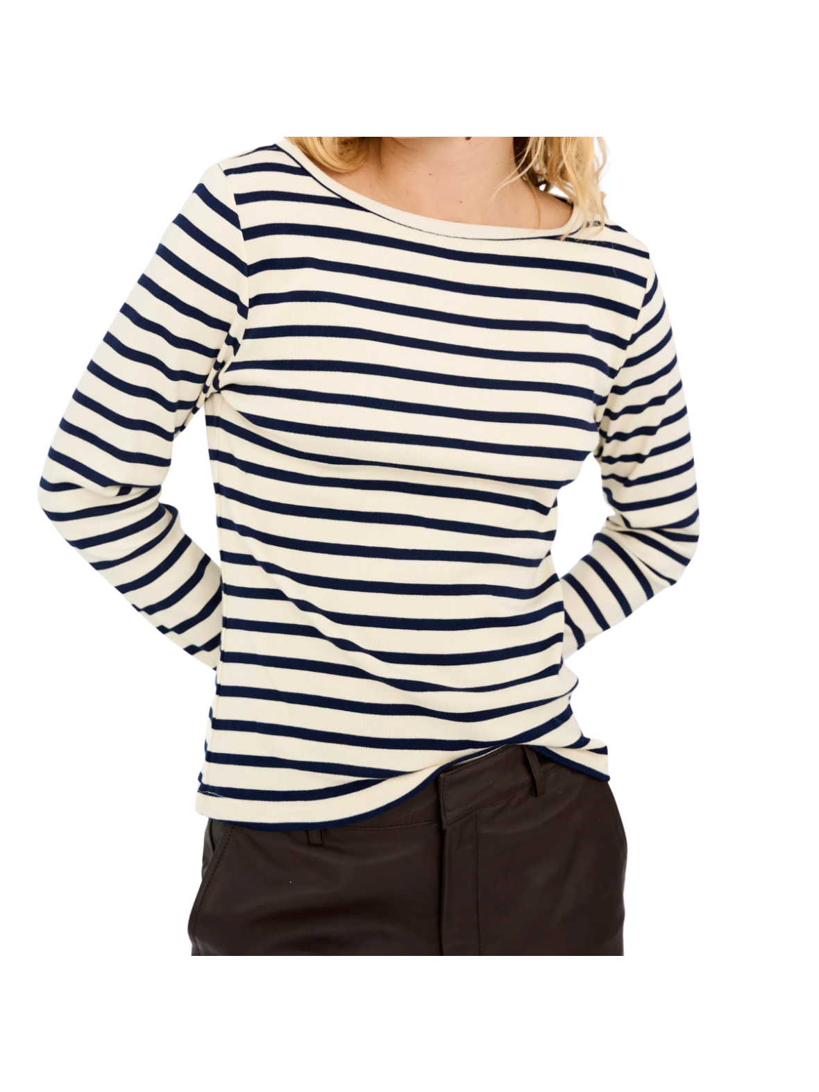 Klassisk stribet bluse i creme og navy med et tidløst, maritimt inspireret udtryk. Den tætsiddende pasform og bløde kvalitet giver både komfort og et flatterende look. Designet med rund hals og lange ærmer, der gør den ideel til lag-på-lag styling. Perfekt til et afslappet, stilrent hverdagsoutfit.