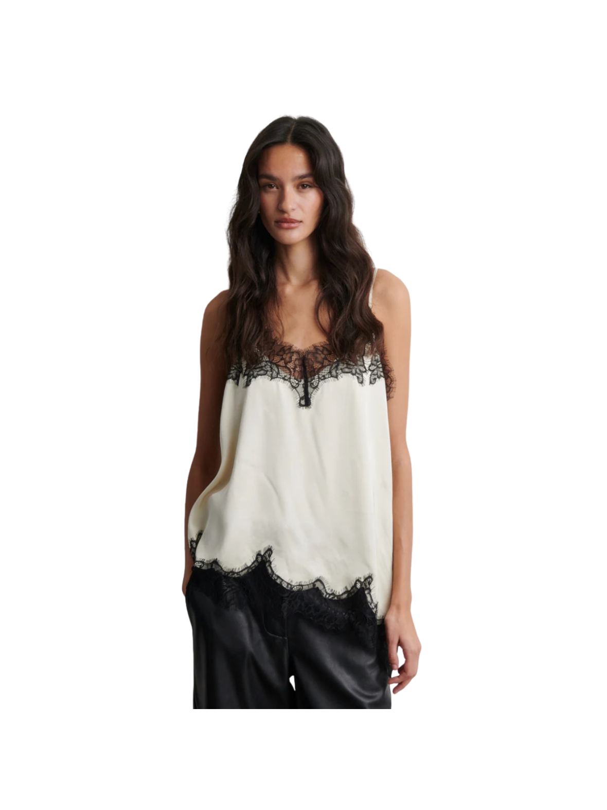 Elegant og feminin top i en smuk cremefarvet nuance med fine sorte blondedetaljer. De tynde stropper og det lette materiale giver et blødt og luksuriøst udtryk, mens den asymmetriske kant tilfører et moderne twist. En sofistikeret style, der både kan bruges til hverdag og fest. Style den med bukser eller nederdel for et elegant look – eller med jeans og blazer for en mere cool og kontrastfuld styling.