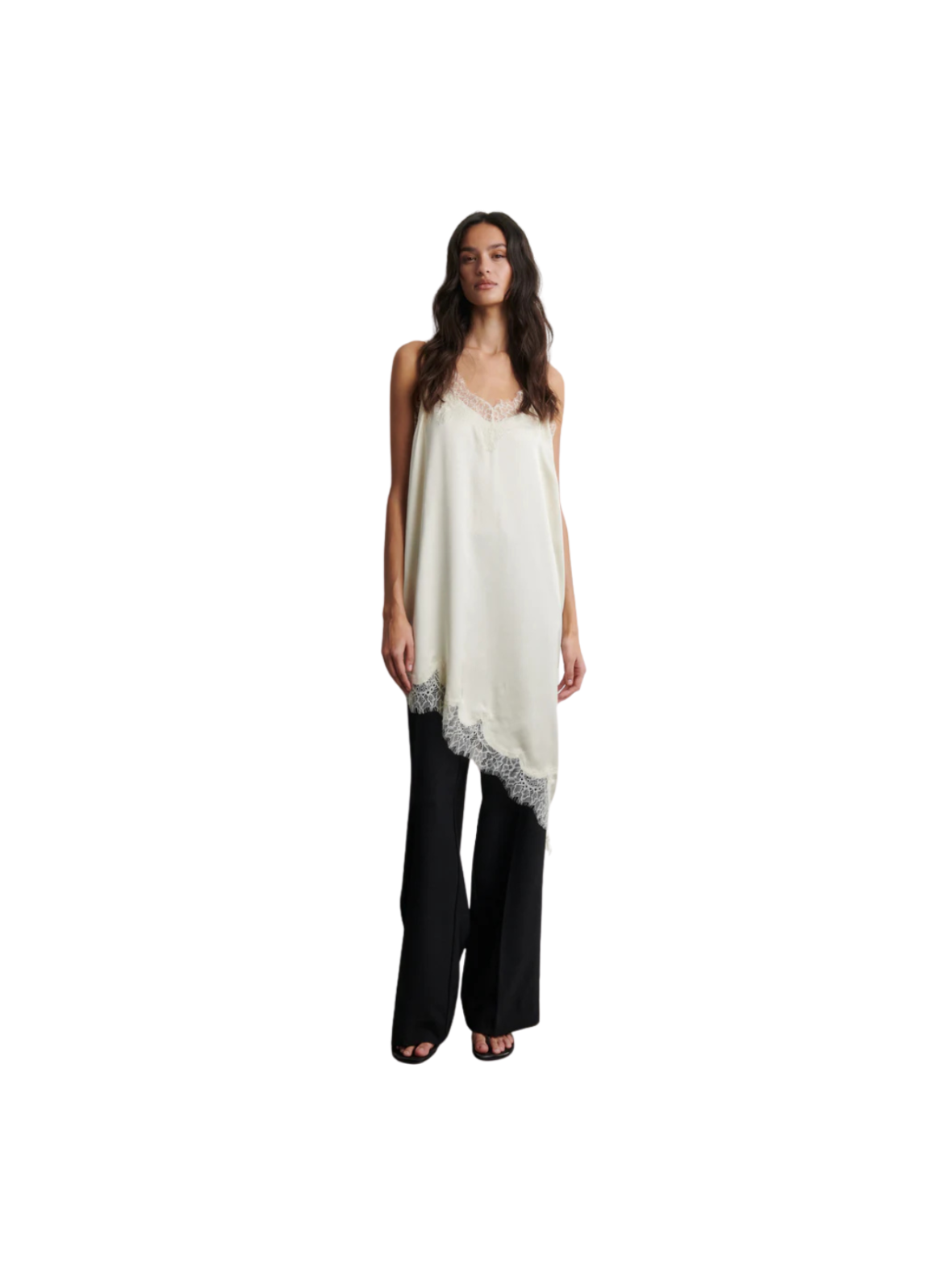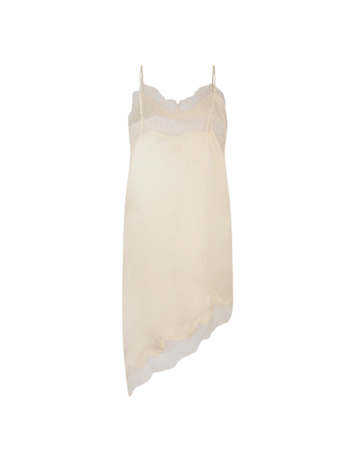 Elegant og feminin slipkjole i en smuk lys creme nuance med fine blondedetaljer. De tynde stropper og det lette, glatte materiale giver et eksklusivt og luftigt udtryk, mens den asymmetriske kant tilfører et moderne twist. En sofistikeret style, der både kan bruges til festlige anledninger eller styles ned til hverdagsbrug. Style den med hæle for et elegant look – eller med en strik og støvler for en mere casual og cool styling.