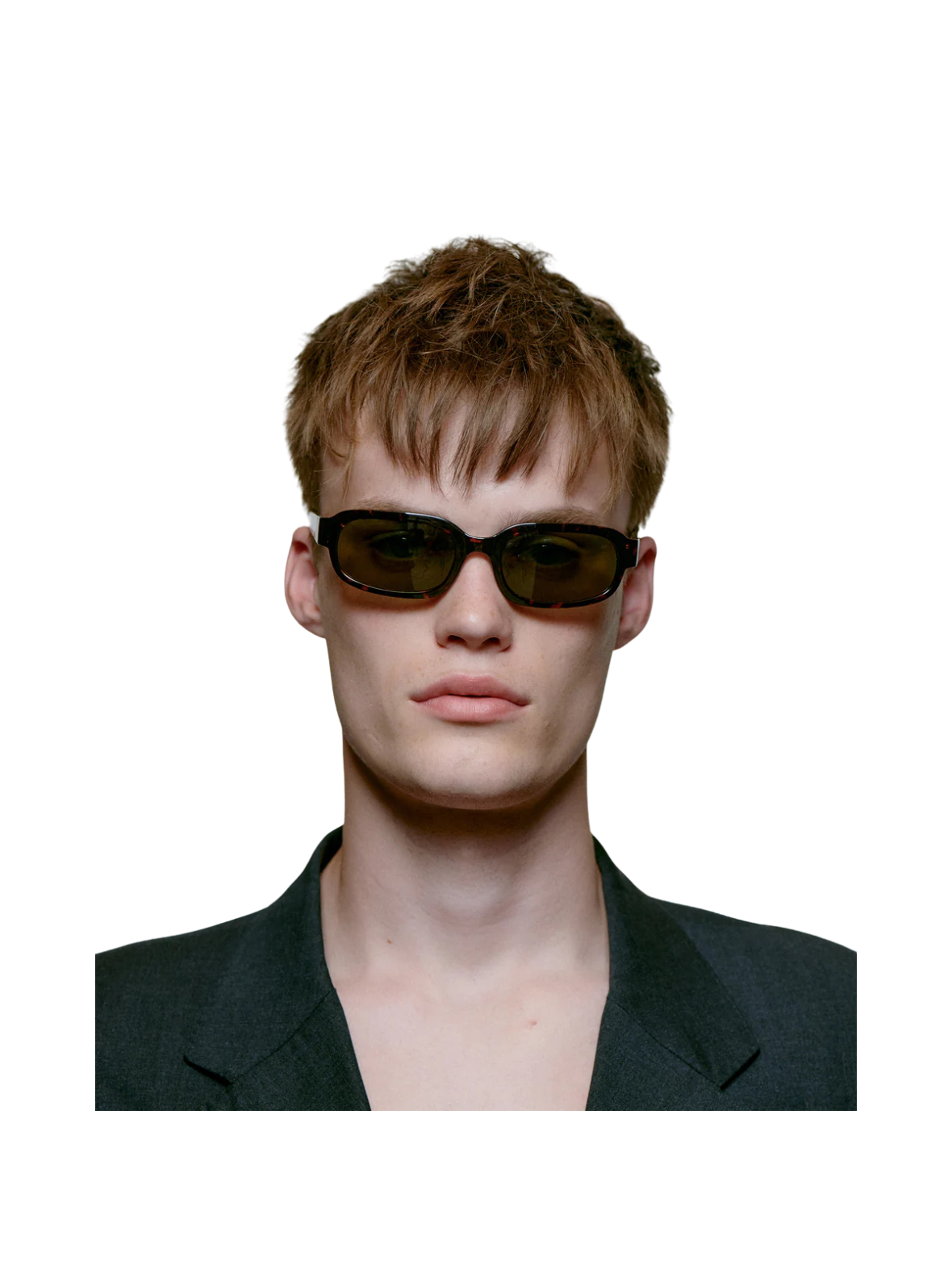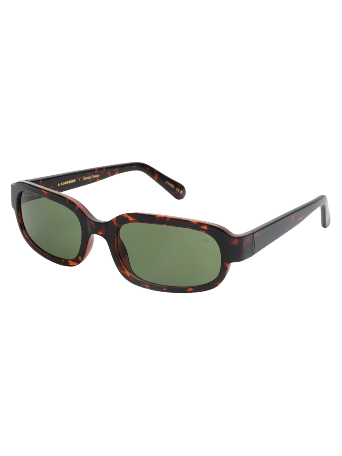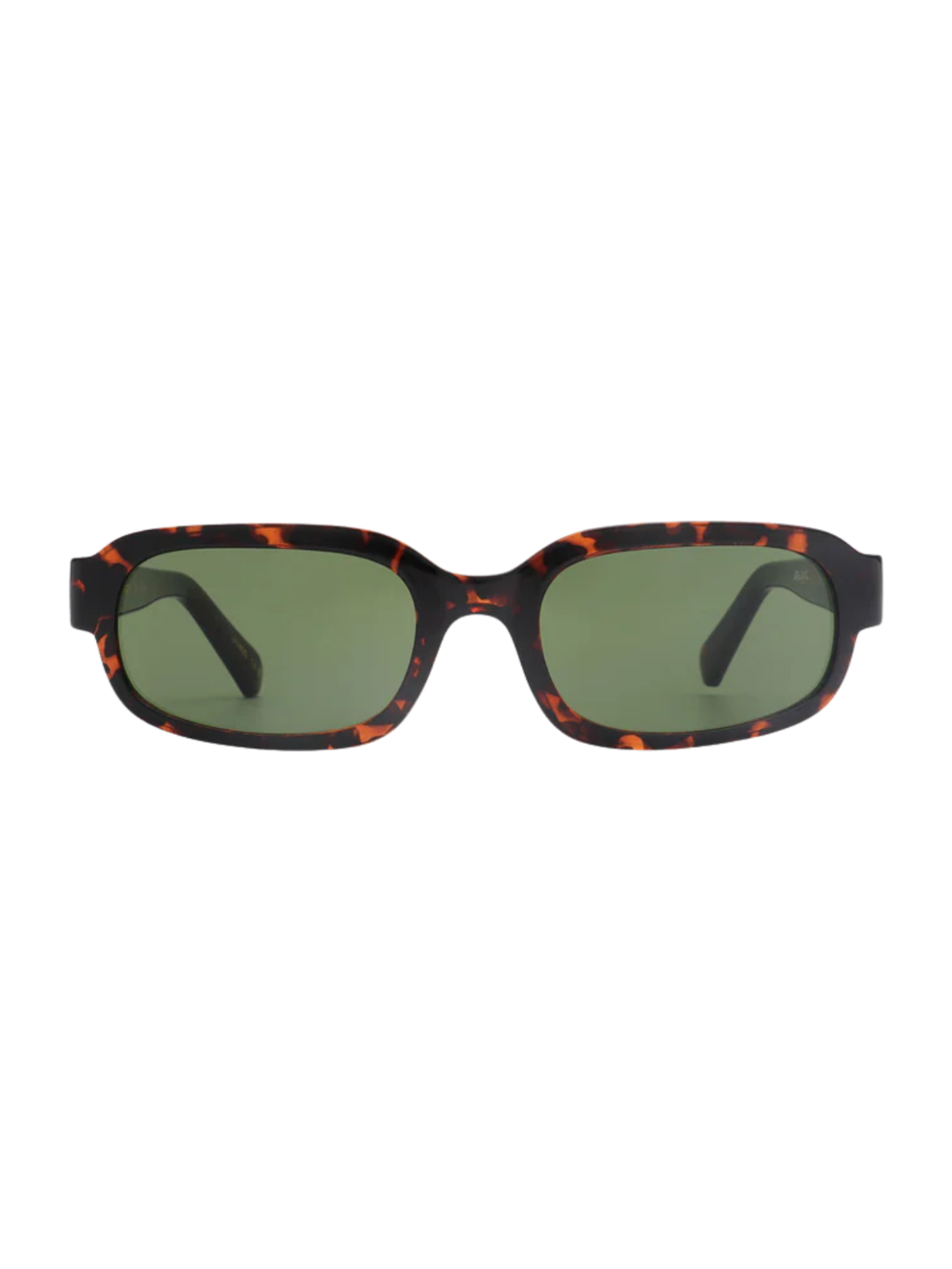 Cool solbriller med et smalt, rektangulært stel i klassisk tortoise-mønster. De grønne glas tilfører et moderne twist og skaber en flot kontrast til de varme brunlige toner. Et stilrent design med et strejf af retro, der giver kant til dit look. Perfekte til både hverdagsbrug og sommerlige outfits – style dem med alt fra denim til lette kjoler for et gennemført finish.