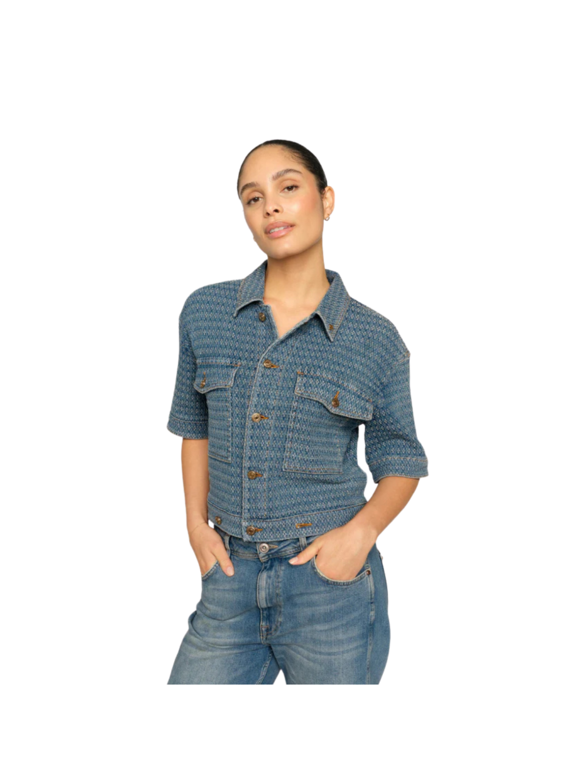 Cool jakke i en smuk blå nuance med struktur og diskret mønster, der giver et unikt og moderne udtryk. Den korte pasform, korte ærmer og klassiske brystlommer skaber en afslappet, men stilren silhuet. Knaplukningen foran tilfører et tidløst denim-inspireret look. Perfekt som et let lag – style den med matchende bukser for et gennemført sæt eller med jeans for en casual og trendy styling.