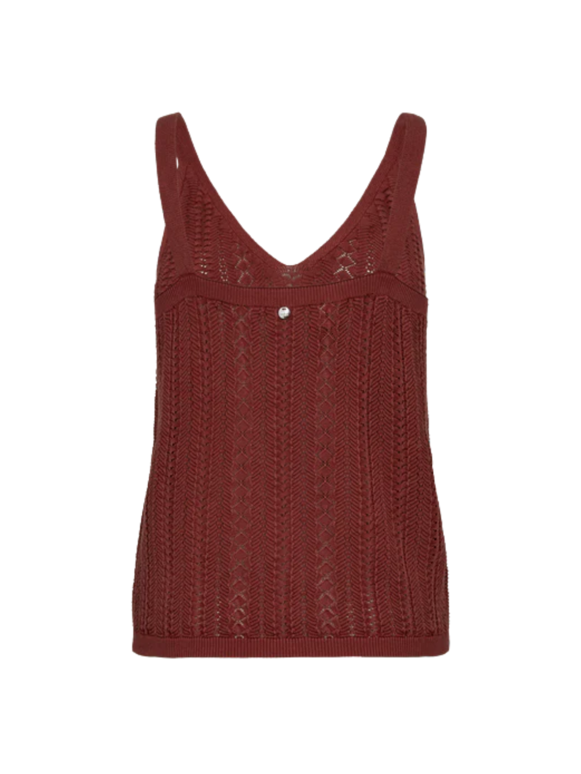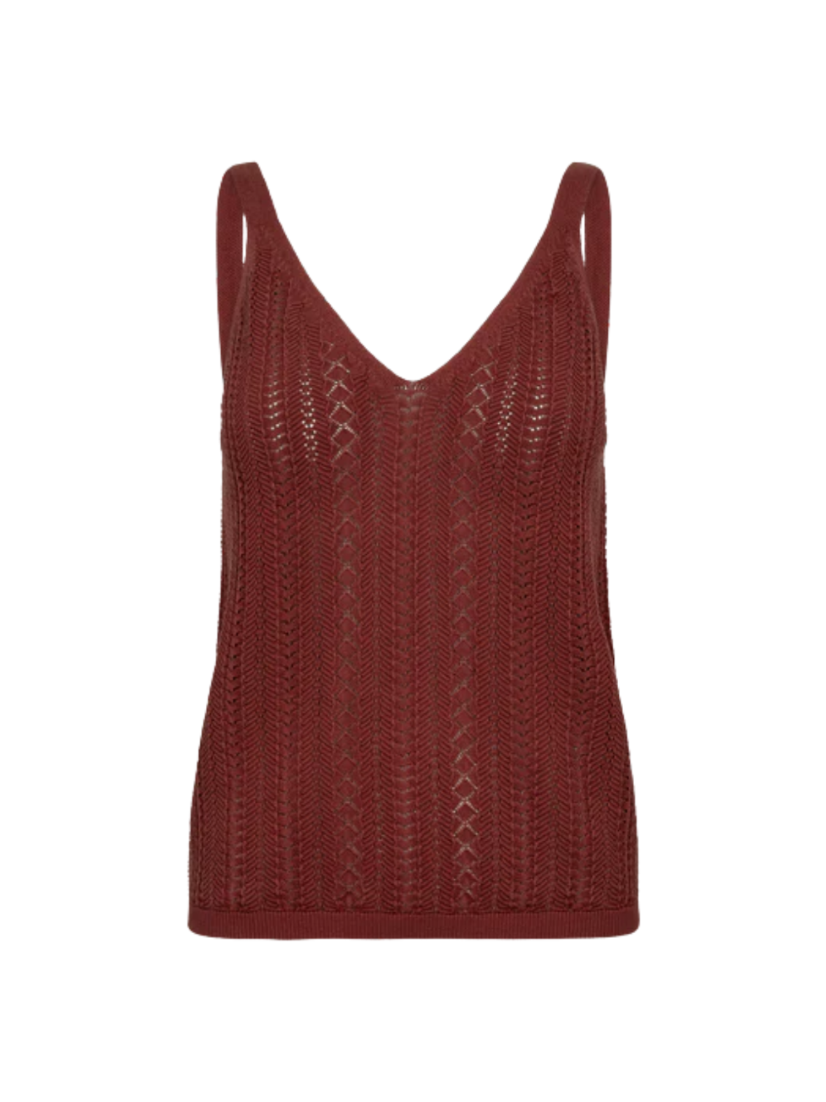 Striktop i en varm rødbrun nuance med fine, feminine hulmønstre. Den lette kvalitet og brede stropper giver et afslappet og sommerligt udtryk. Style den med jeans, shorts eller en nederdel for et ubesværet og stilfuldt look. En alsidig top, der tilfører garderoben farve og karakter.