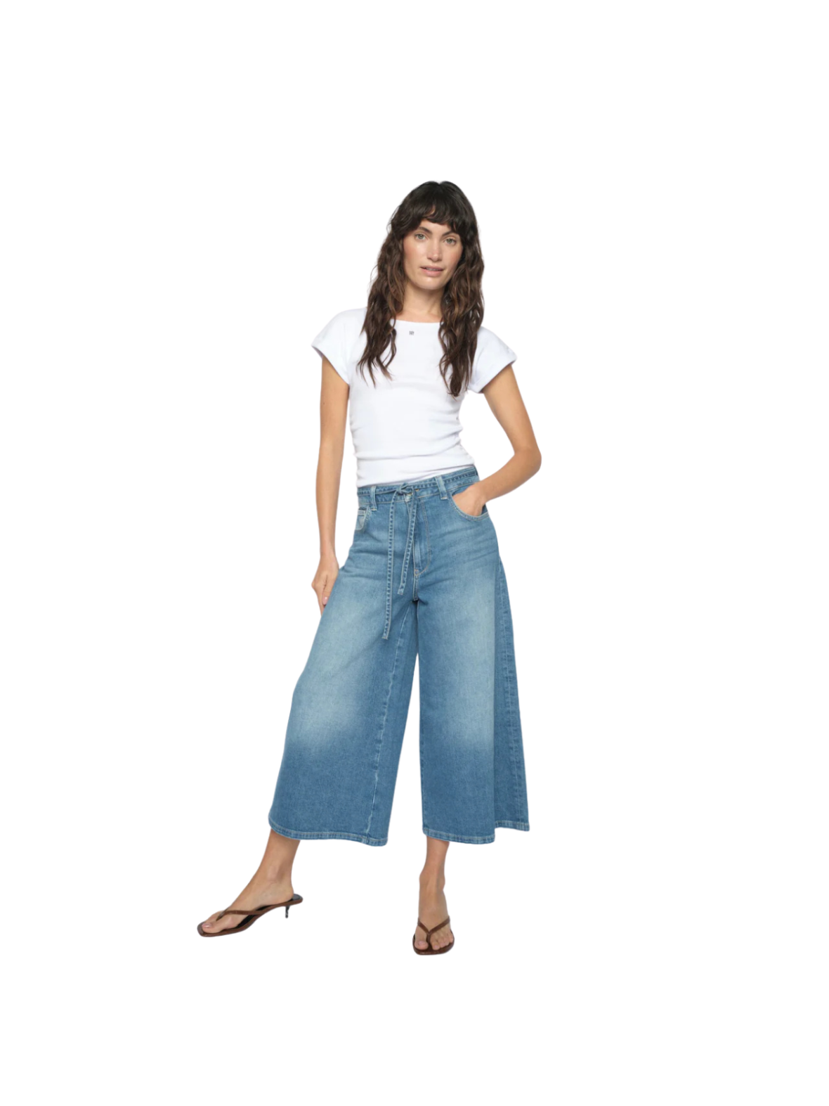 Moderne culotte jeans i en lys blå vask med et afslappet og trendy udtryk. Den brede, korte pasform og bindebånd i taljen giver et casual look med fokus på komfort. Style dem med en enkel top og sandaler til varme dage eller med sneakers og strik for et mere hverdagsvenligt outfit. Et par jeans, der kombinerer lethed og cool attitude.