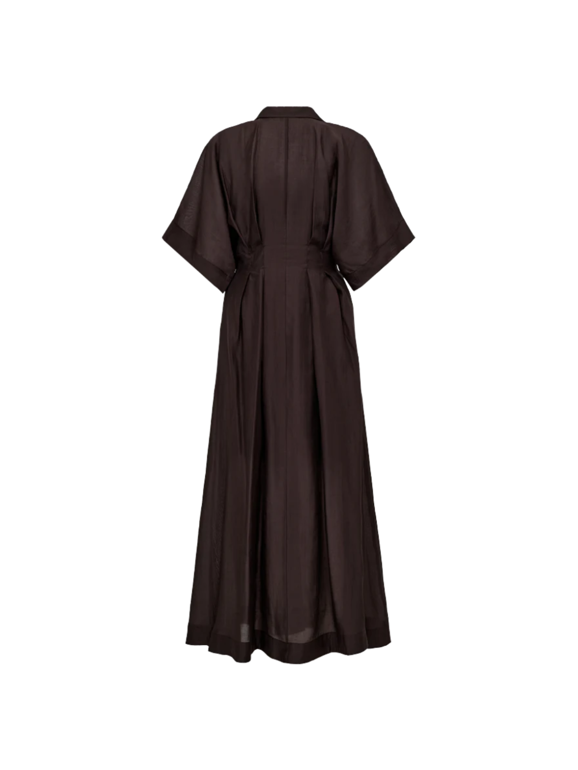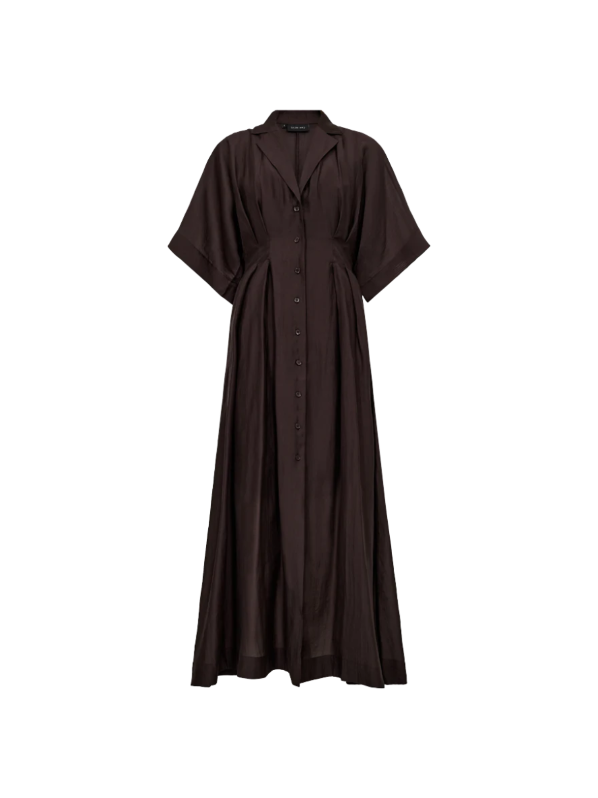 Elegant skjortekjole i en dyb brun nuance med et sofistikeret og feminint udtryk. Den markerede talje og løse fald skaber en flot silhuet med god bevægelsesfrihed. Knaplukningen foran giver et klassisk touch, mens de korte, brede ærmer tilfører et moderne look. Perfekt til både hverdagsbrug og mere formelle anledninger.