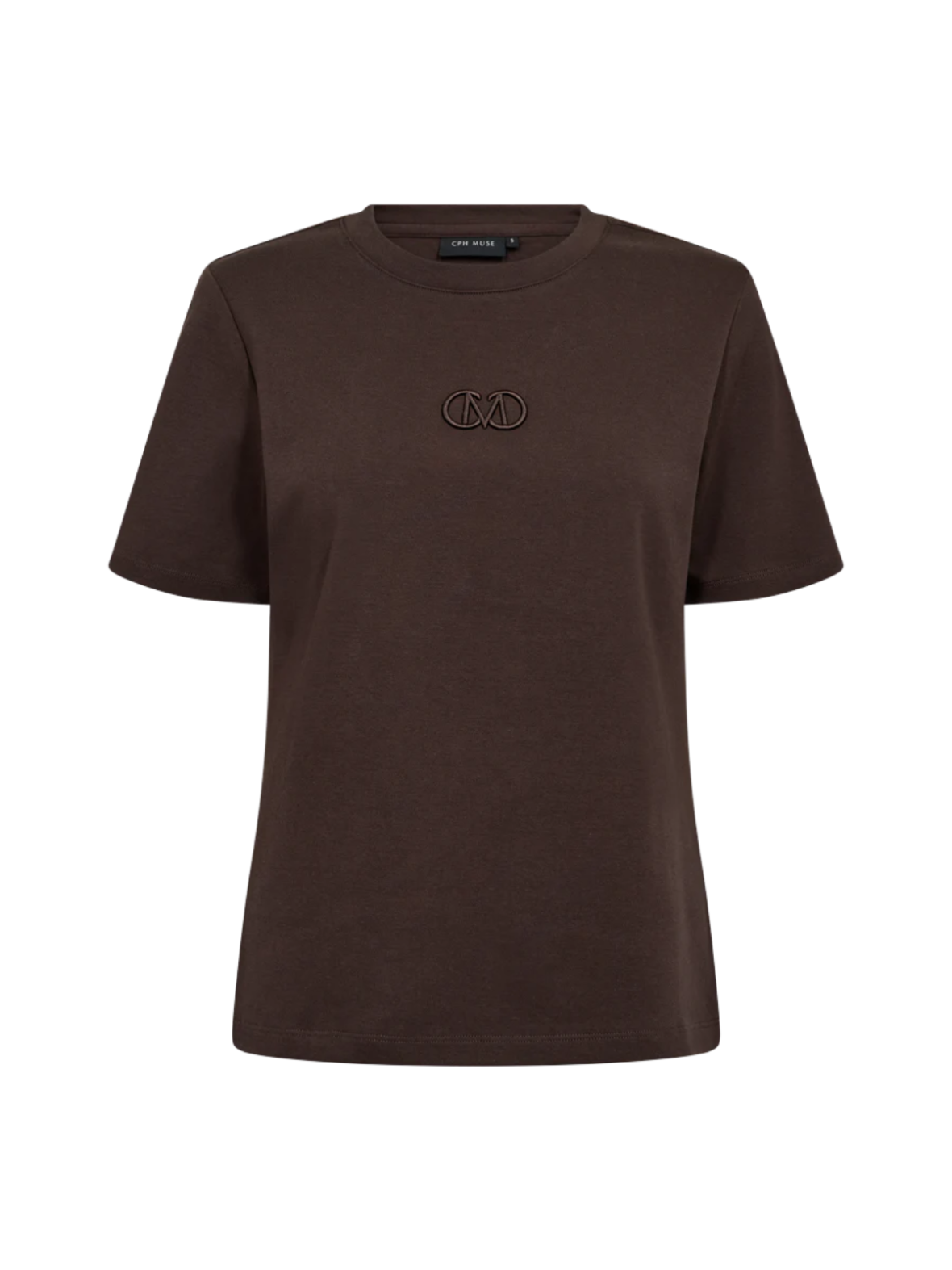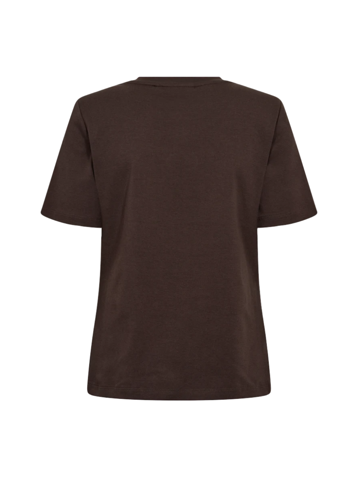 Enkel T-shirt i en dyb brun nuance med et stilrent og moderne udtryk. Den klassiske pasform og bløde kvalitet gør den behagelig at have på hele dagen. Det diskrete logo foran tilfører et eksklusivt og minimalistisk touch. En alsidig basisstyle, der nemt kan styles til både hverdag og afslappede looks.