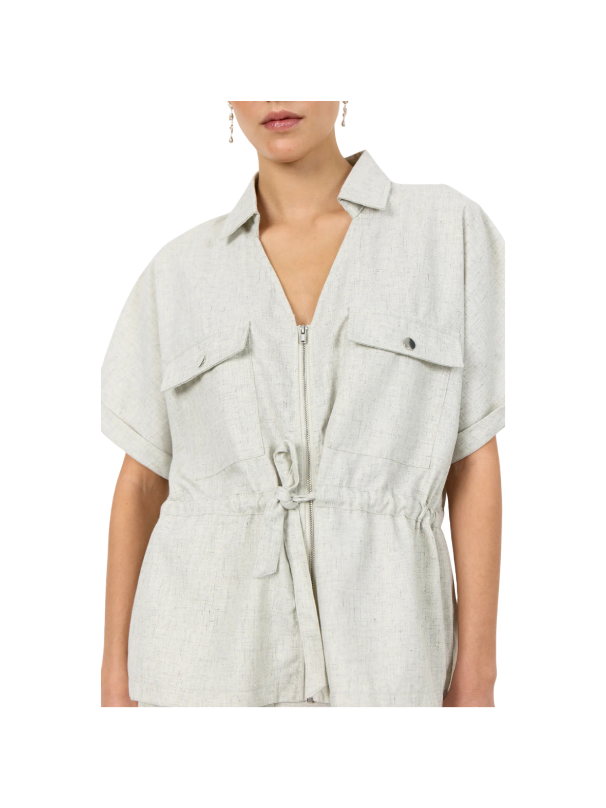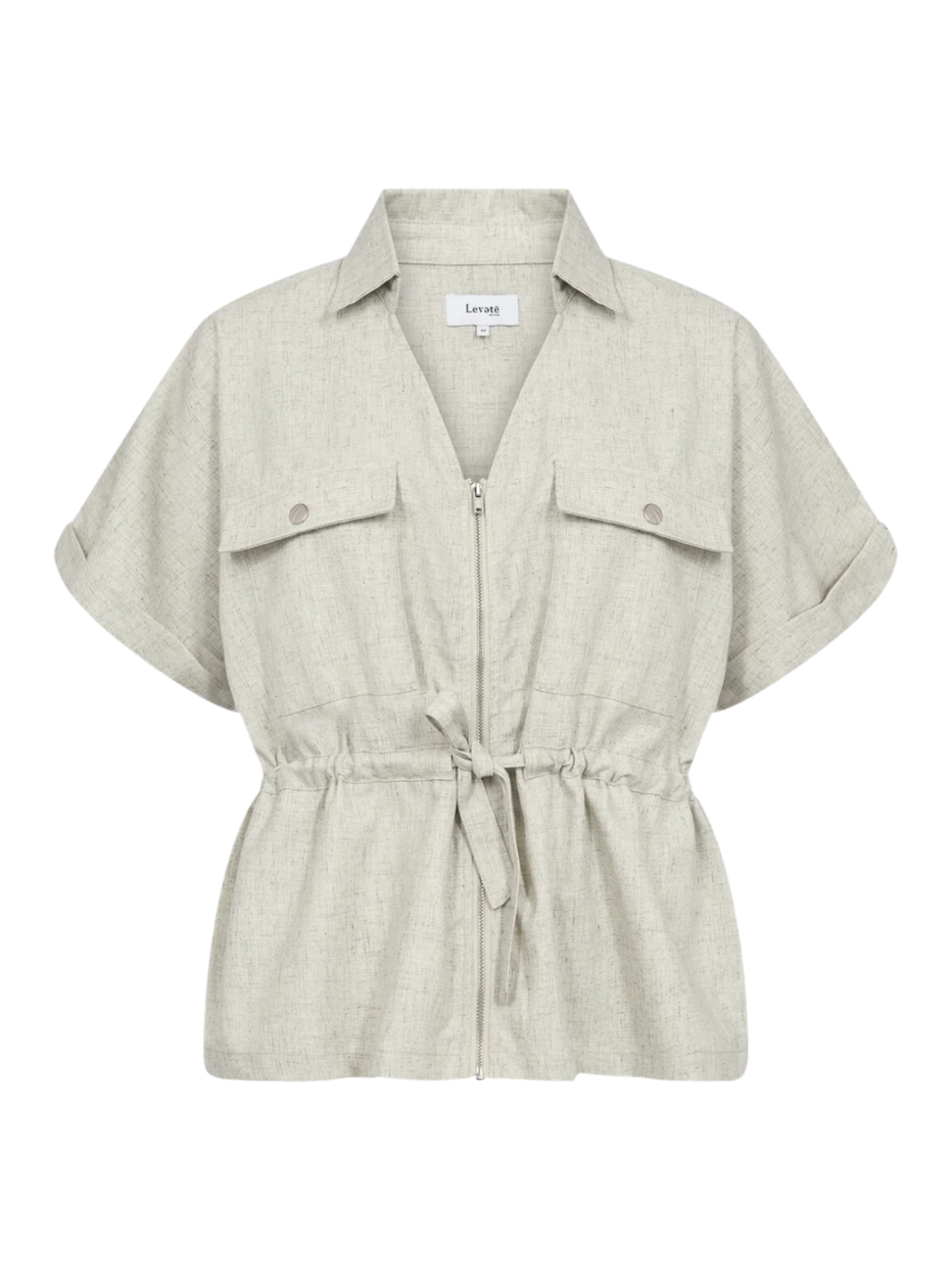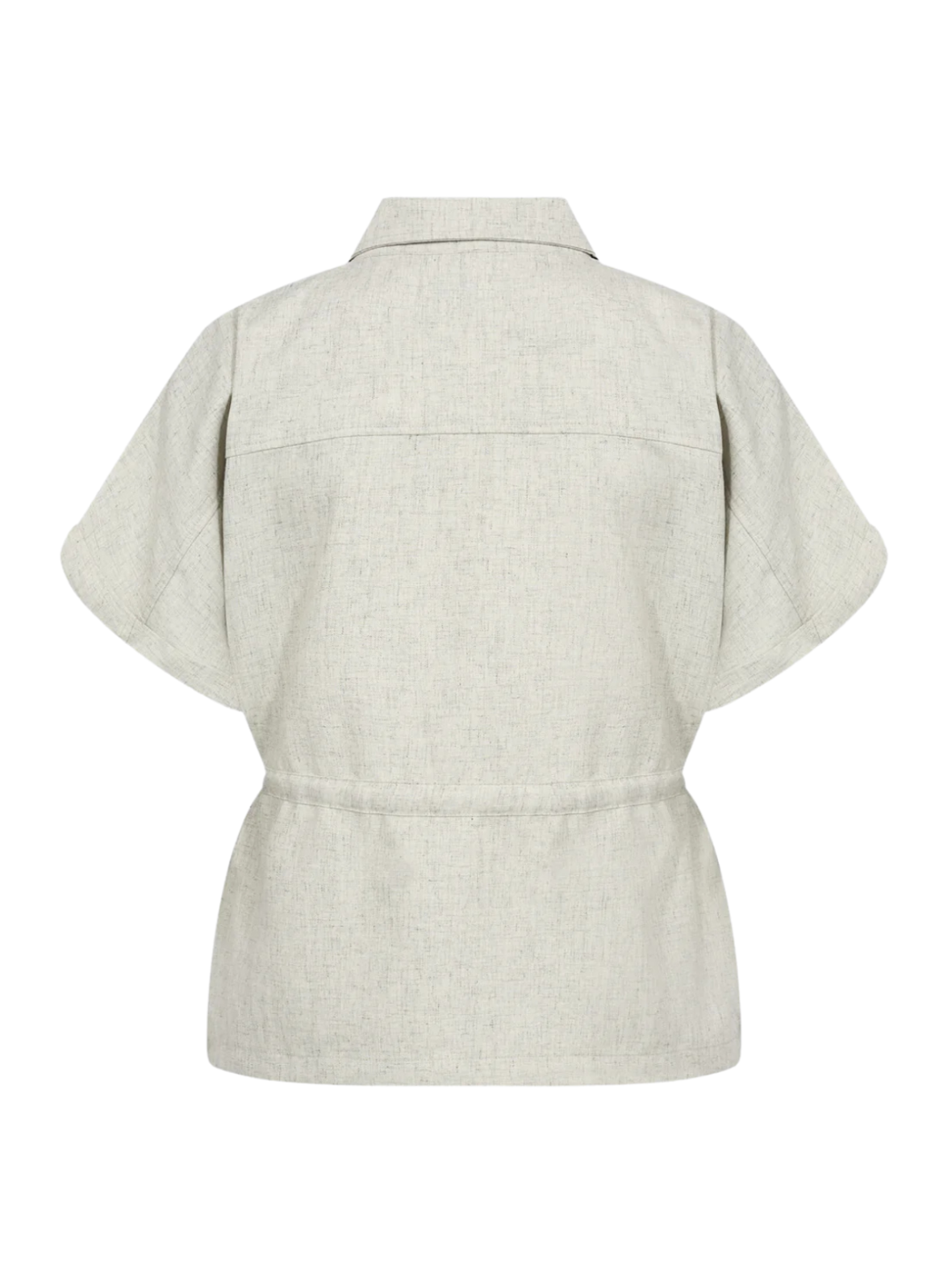 Let og moderne jakke i en lys beige nuance med et afslappet og stilrent udtryk. De korte ærmer, frontlommer og lynlåslukning giver et funktionelt og cool look. Snøredetaljen i taljen fremhæver silhuetten og tilfører et feminint touch. Perfekt som et let lag over både kjoler og hverdagsoutfits.