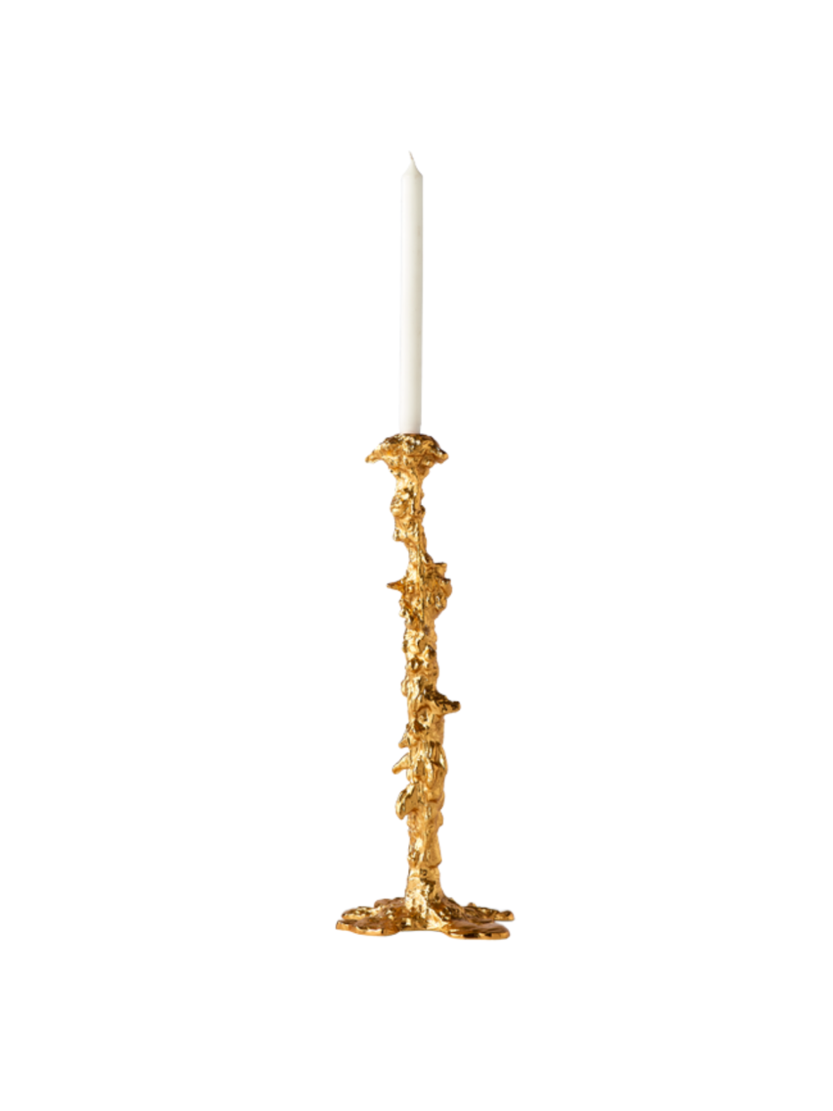 Skulpturel lysestage i en smuk gylden finish med et råt og kunstnerisk udtryk. Den organiske form giver et unikt look, der tilfører personlighed til indretningen. Perfekt som et dekorativt element på bordet eller i vindueskarmen. En iøjnefaldende lysestage, der kombinerer elegance med et moderne twist.