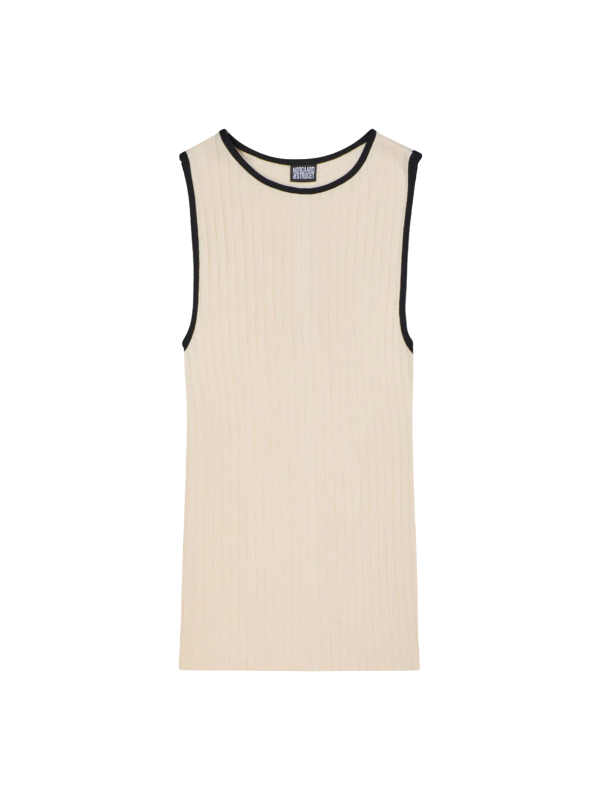 Enkel og stilren ribtop i en lys creme nuance med kontrastkanter i sort, der giver et moderne og grafisk udtryk. Den tætsiddende pasform og bløde kvalitet gør den perfekt som både basislag og selvstændig top. Style den med jeans, shorts eller under en skjorte for et afslappet og stilfuldt look. En alsidig top, der kombinerer komfort med et skarpt design.